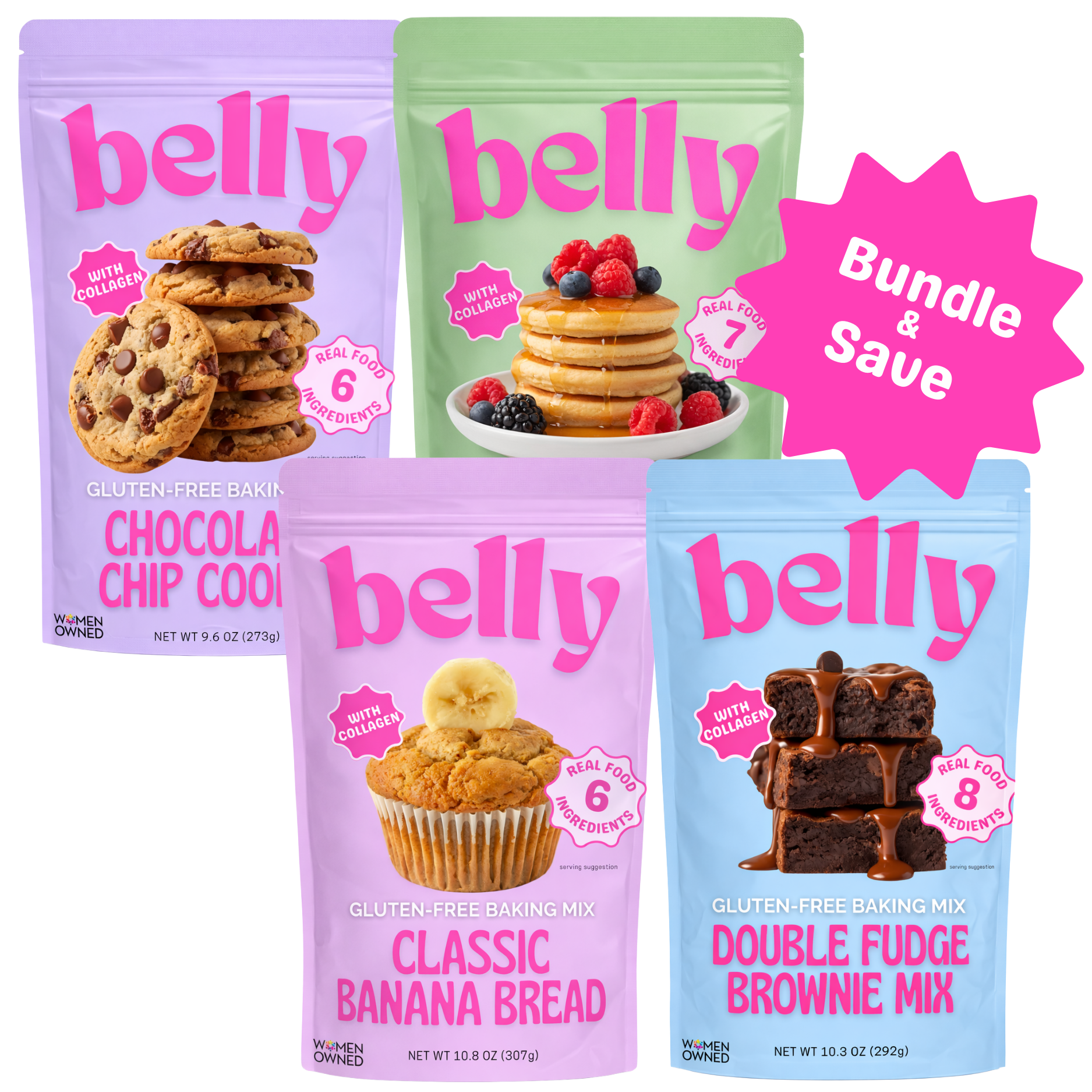 This bundle includes all of your favorite flavors: chocolate chip cookie, chocolate brownie, banana bread and pancake/waffle mix.Β